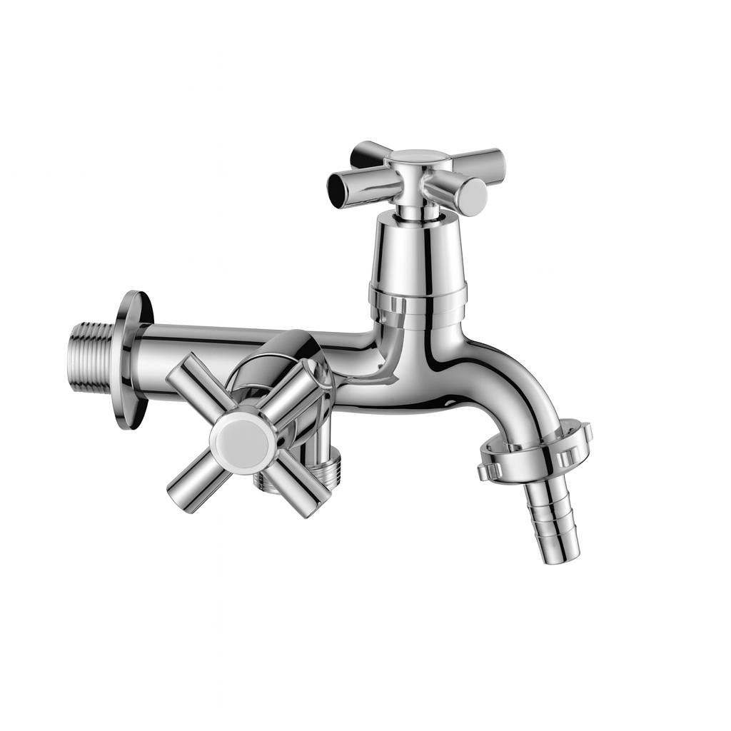 Torneira fixa de ABS cromada com cruzeta para tanque com saída para máquina de lavar